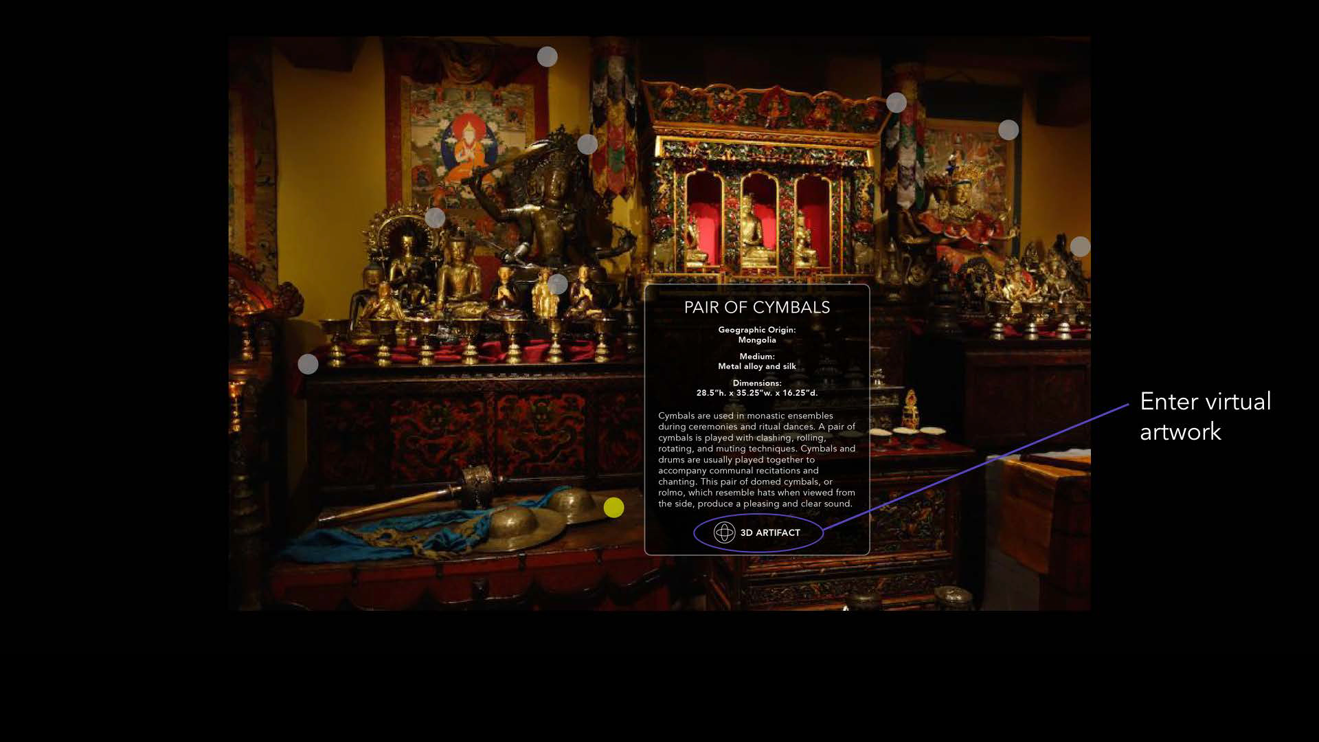 Near the objects, an information icon is displayed to indicate the availability of information regarding the surrounding artifacts. By selecting an object, users can acquire more knowledge about it, similar to reading description panels in a real-life museum.