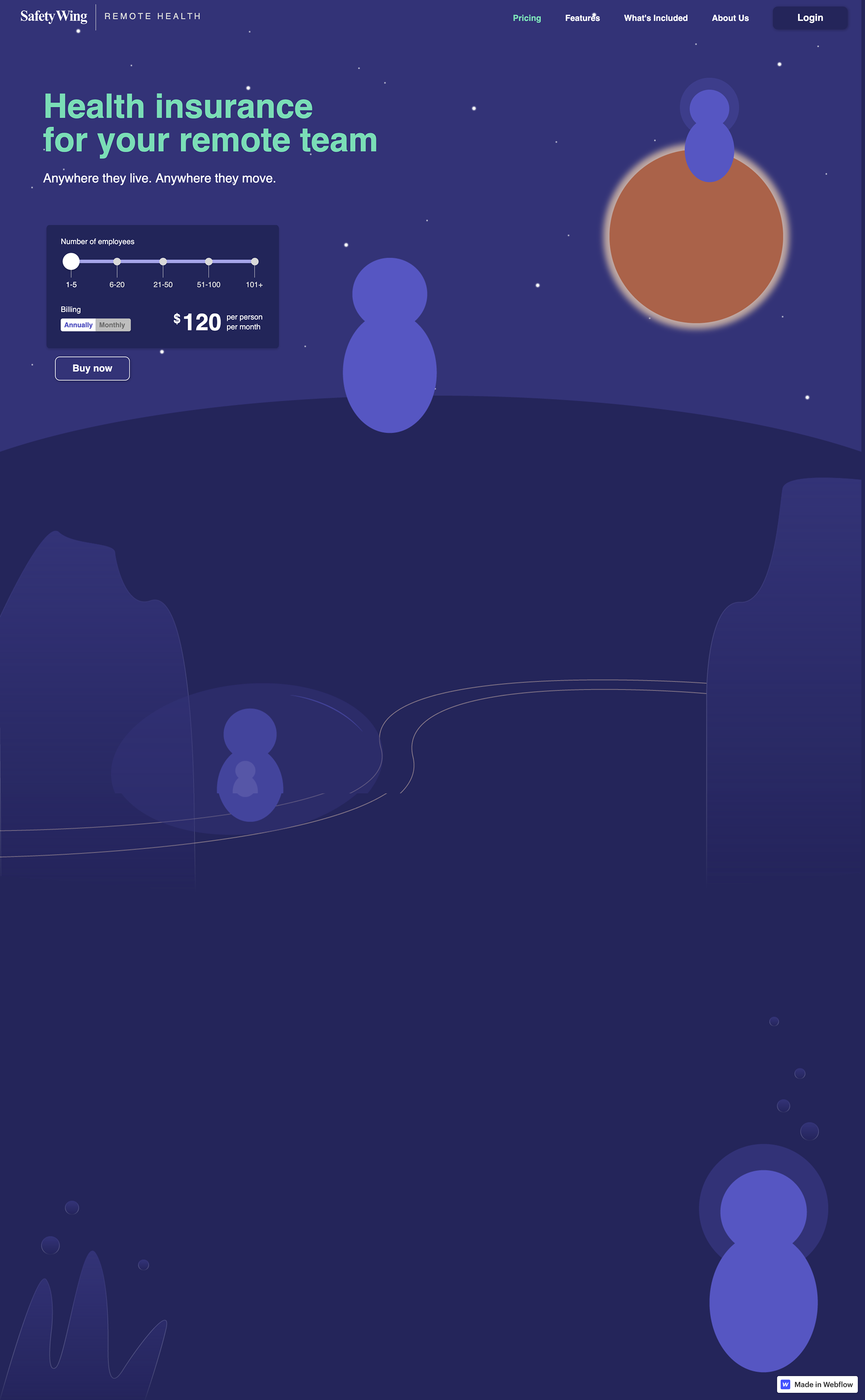 The landing page's top section should be able to provide a summary of the whole story, similar to a movie's synopsis. The initial frame conveys to users that a team can consist of just two people, as depicted by two illustrated characters. Additionally, the employee scale demonstrates that even solo remote workers are eligible. The depiction of two different planets represents how users can work from anywhere.