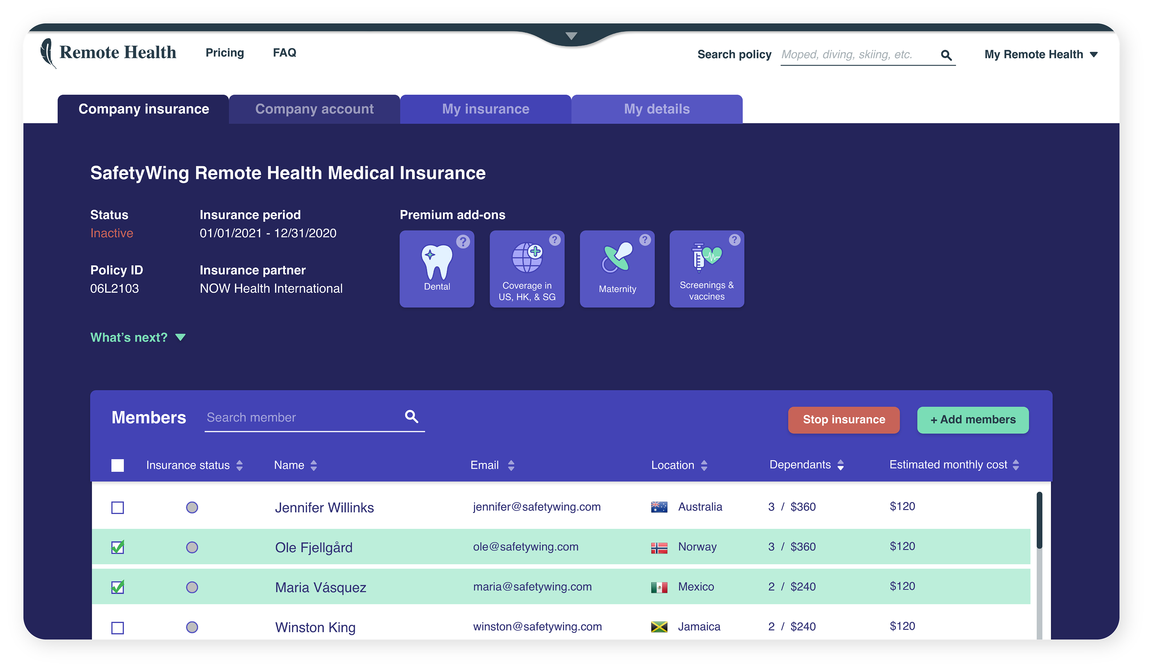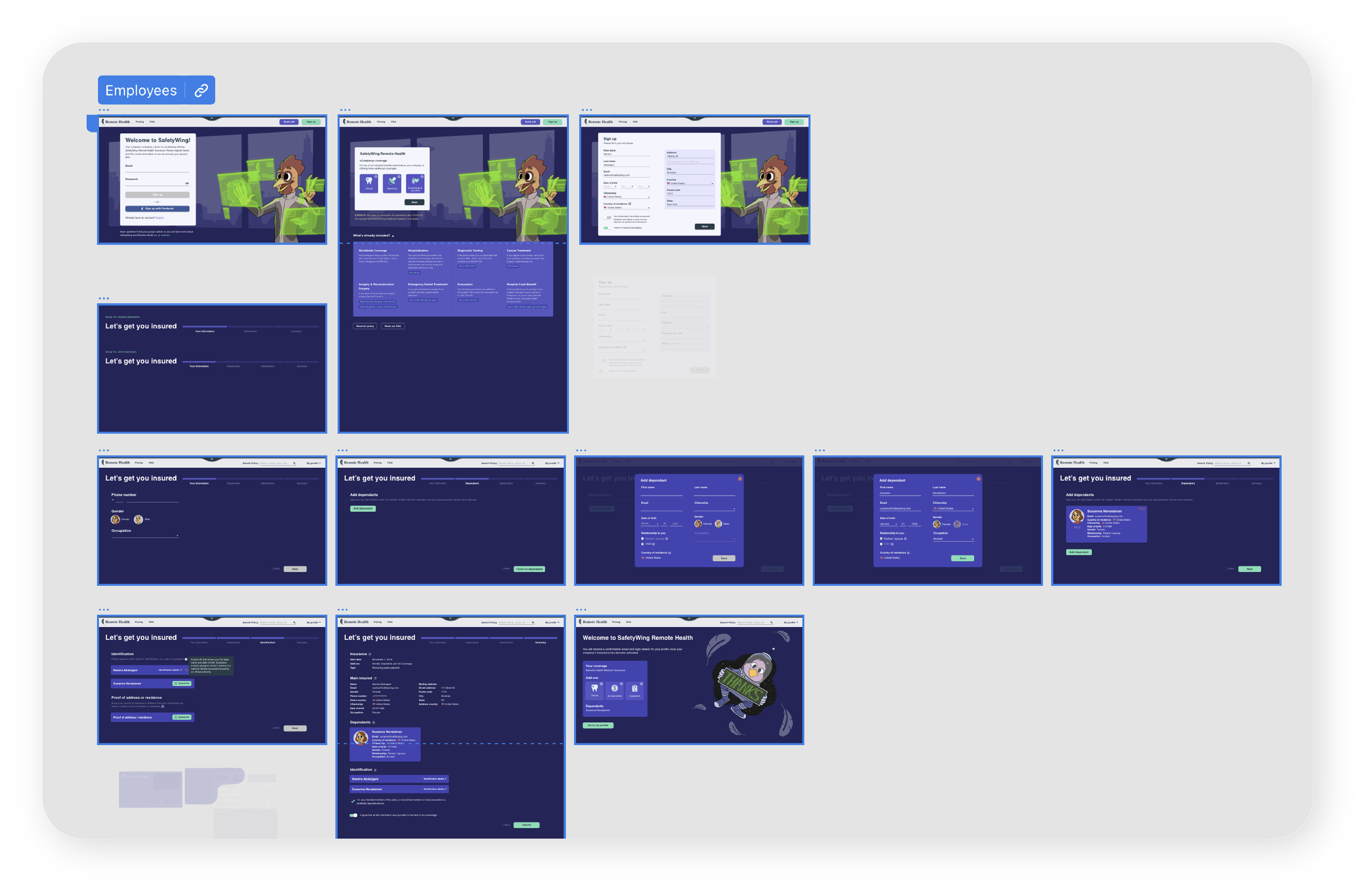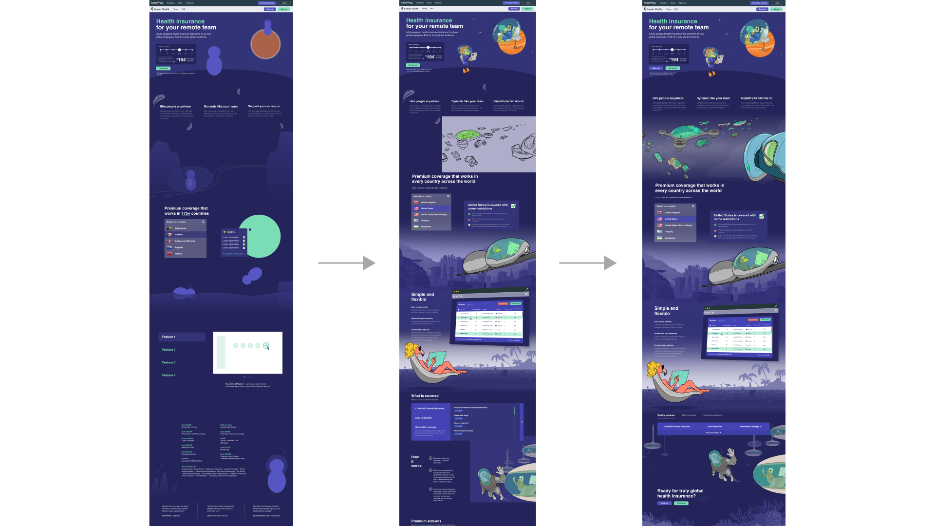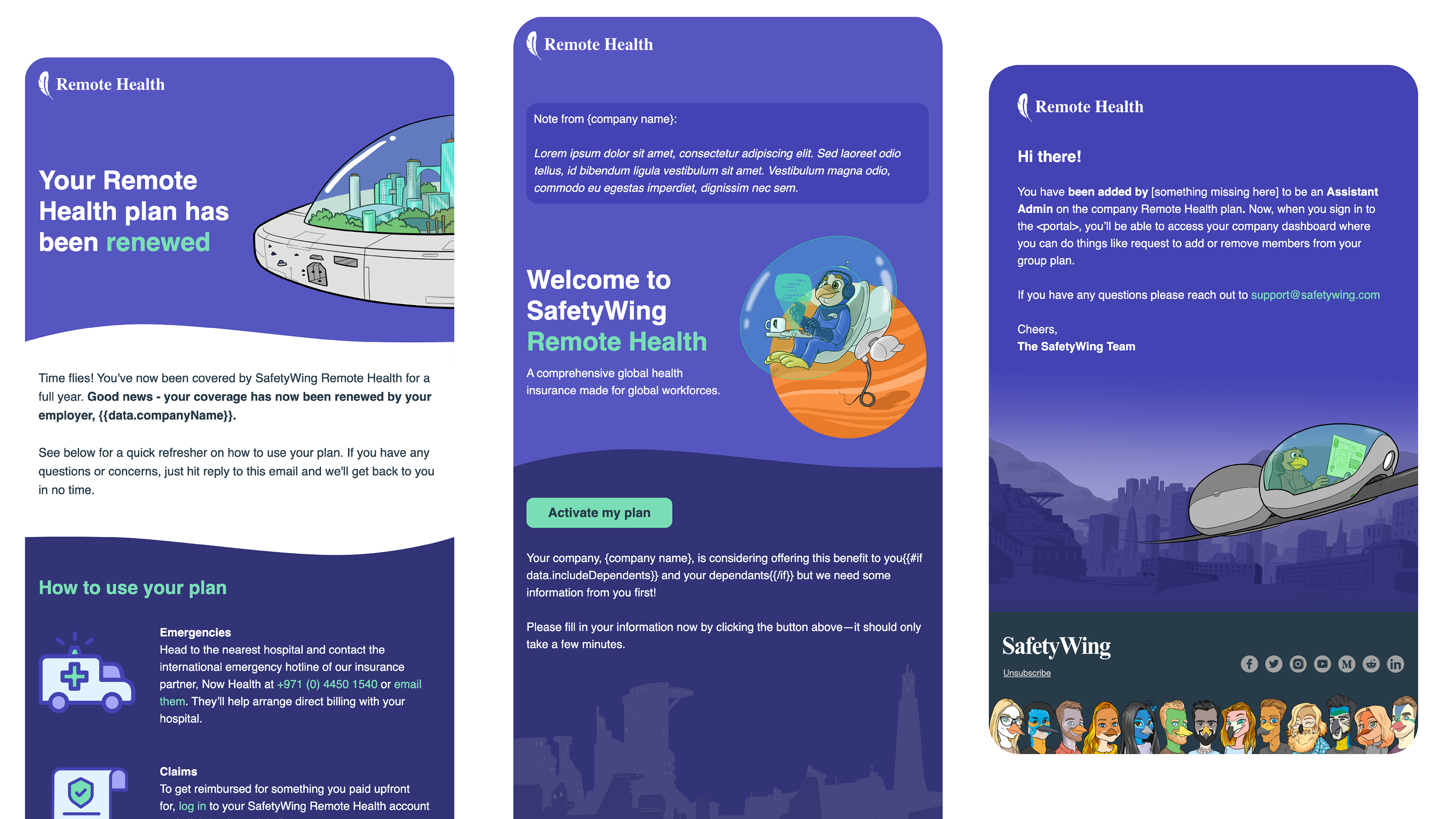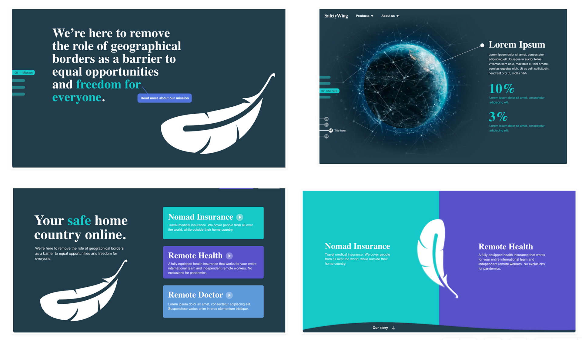 We decided to separate the SafetyWing brand from its initial product to focus on the community and people who use our products for digital nomads and remote workers. We have also developed a new branding strategy for the SafetyWing umbrella brand and its products while maintaining the original colors for the initial product to uphold familiarity and trust with our customers. The new product's colors reflect a certain professionalism that aligns with our retrofuturistic world and represents the new segment well. For our travel and medical insurance, we've named it Nomad Insurance, and for our global health insurance for remote companies, we've named it Remote Health.